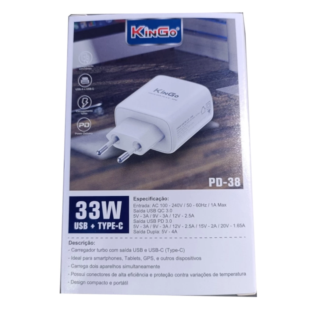 O carregador de parede KinGo, modelo PD-38, é uma fonte de alimentação potente e versátil, projetada para o carregamento rápido e seguro dos seus dispositivos. Com uma potência total de 33W, ele possui duas portas: uma USB-C com tecnologia Power Delivery (PD 3.0) e uma USB-A com Quick Charge (QC 3.0). Isso permite carregar aparelhos compatíveis, como iPhones, celulares Android e tablets, de forma muito mais eficiente. É possível carregar dois dispositivos simultaneamente. O carregador conta com um chipset certificado para carregamento inteligente e um sistema de proteção completa contra superaquecimento, curto-circuito e sobrecarga, garantindo a segurança dos seus aparelhos.