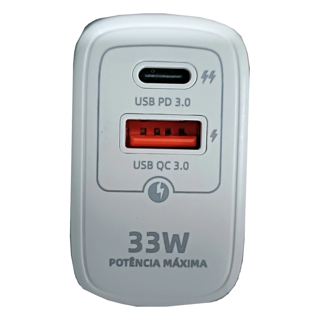 Carregue seus dispositivos na máxima velocidade com a fonte turbo de 33W da KinGo. Com duas saídas (USB-A e USB-C), é compatível com os protocolos de carregamento rápido Power Delivery (PD) e Quick Charge (QC), ideal para smartphones, tablets e notebooks.